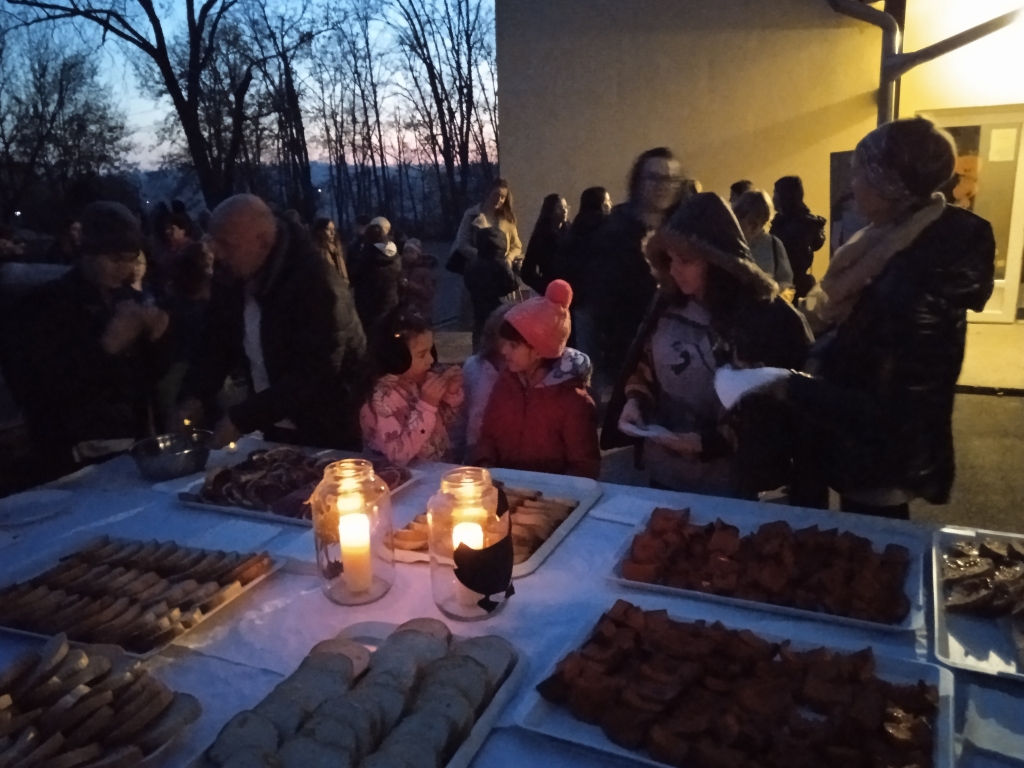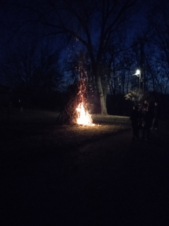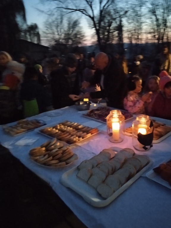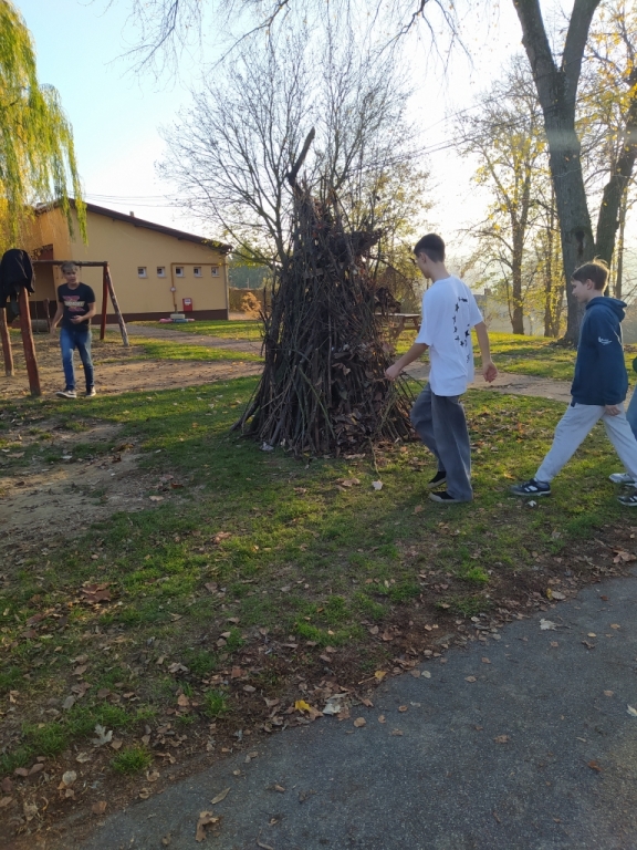 Miután elkészültek a lámpások, elindult a menet a faluba. Visszatérve az iskolához hagymás zsíros kenyér, lekváros kenyér, sült tök, forró tea várta a résztevevőket. A meggyújtott máglya volt a nap fénypontja.